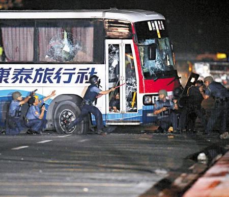 事發(fā)近10小時(shí)后綁匪與菲律賓國(guó)家警察馬尼拉警區(qū)特種武器和戰(zhàn)術(shù)部隊(duì)及特別行動(dòng)隊(duì)爆發(fā)槍戰(zhàn),交火逾1小時(shí)后綁匪被擊斃。最后15名被挾持的人質(zhì)中,8死7傷。